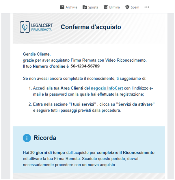 Per completare il riconoscimento ed attivare la firma digitale hai a disposizione 30 giorni di tempo.