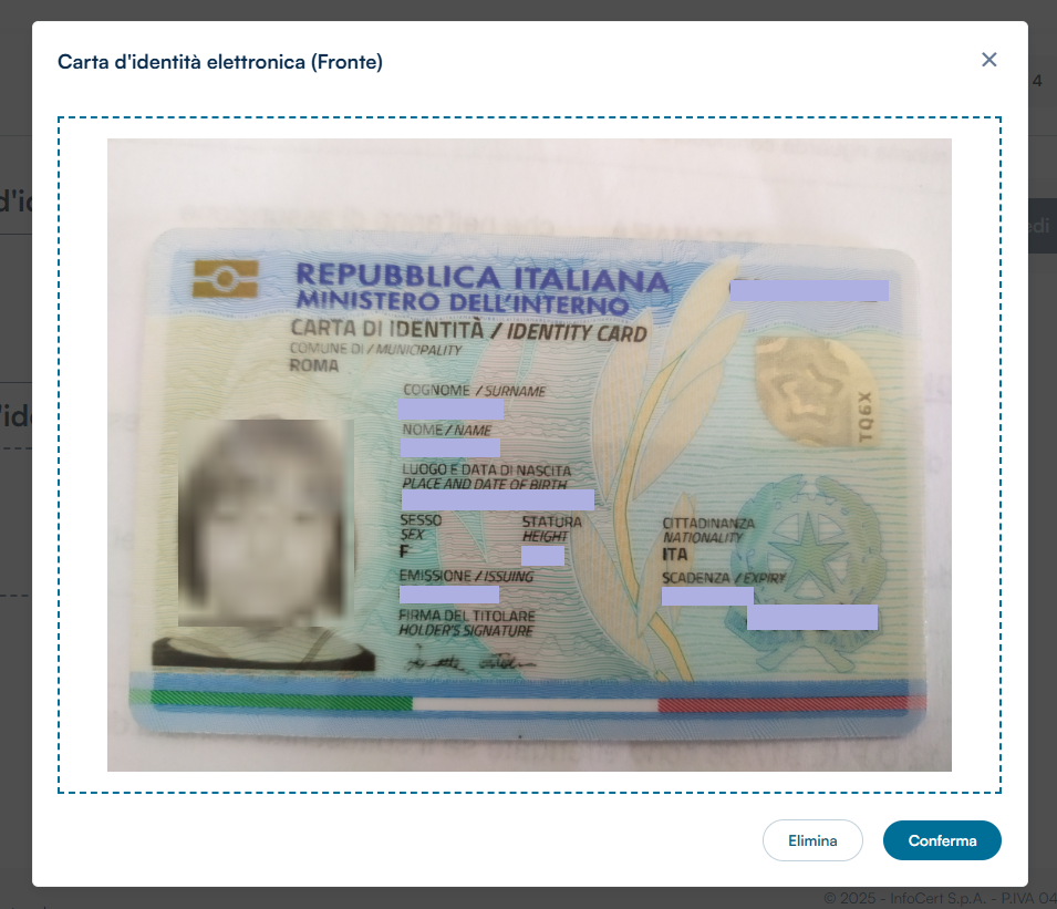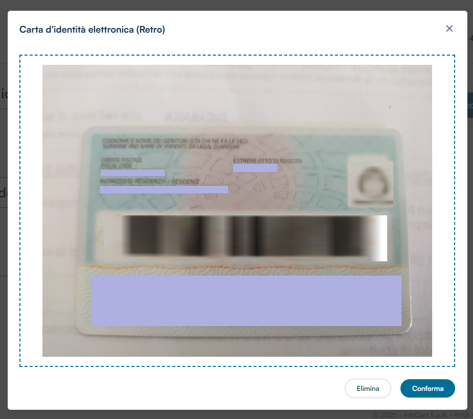 Caricare prima lato Fronte, verificando che il documento sia leggibile, poi dal tasto Conferma passare al caricamento del Retro.