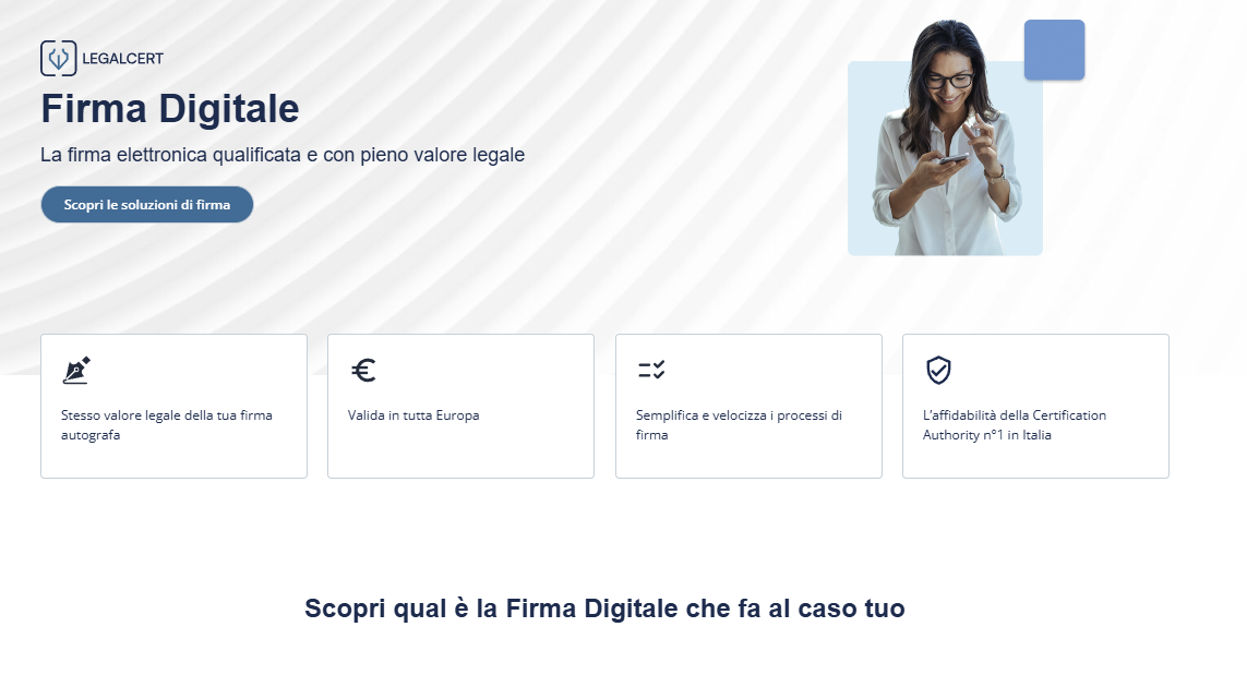 All’interno della sezione del sito InfoCert dedicata alla Firma Digitale è possibile trovare le informazioni utili sul servizio e, cliccando sul pulsante Scopri le soluzioni di firma si potrà visualizzare l’area da cui iniziare il processo di richiesta della Firma Digitale remota con Riconoscimento Video.