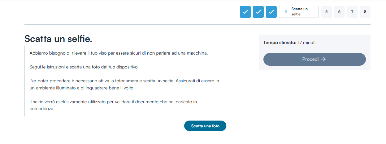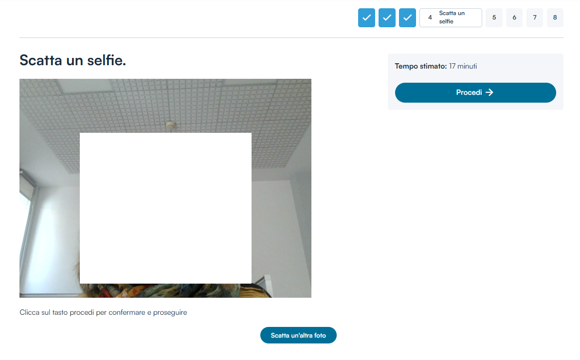 Nel passaggio 4 si richiede di scattare un selfie dal dispositivo in uso, utile unicamente per la fase di riconoscimento video.