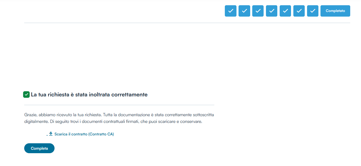 Facendo click sul link Scarica il contratto, si ha la possibilità di visionare la propria documentazione firmata e salvarla sul proprio dispositivo nel formato PDF. Un ultimo clic sul pulsante Completa metterà fine al processo.