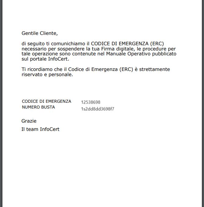 Come indicato nel passaggio 7 dopo l’impostazione del PIN di firma, sulla mail associata al servizio si riceverà la conferma di attivazione della Firma Remota, contenente il codice IUT e allegata la Busta ERC.