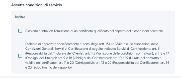 Se il cliente possiede già un Certificato Digitale di Firma attivo associato ad almeno uno dei 3 seguenti fattori (e-mail, cellulare, CF) non sarà possibile attivarne un altro sulla propria utenza. In tal caso, è necessario inserire un indirizzo e-mail, CF e numero di cellulare diverso dall'acquirente.
