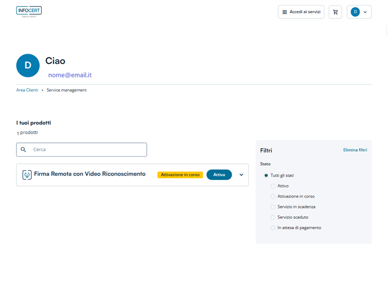 Una volta completata la fase di acquisto, nell'Area Riservata alla sezione I Tuoi prodotti si potrà cliccare sul tasto Attiva in corrispondenza del servizio appena richiesto.