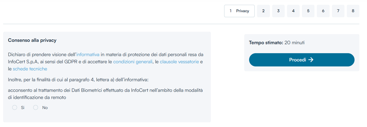La schermata successiva permetterà di Compilare il consenso alla Privacy. Un clic sul tasto Procedi consentirà di andare avanti nella fase di riconoscimento. Il consenso per i Dati Biometrici è Obbligatorio.