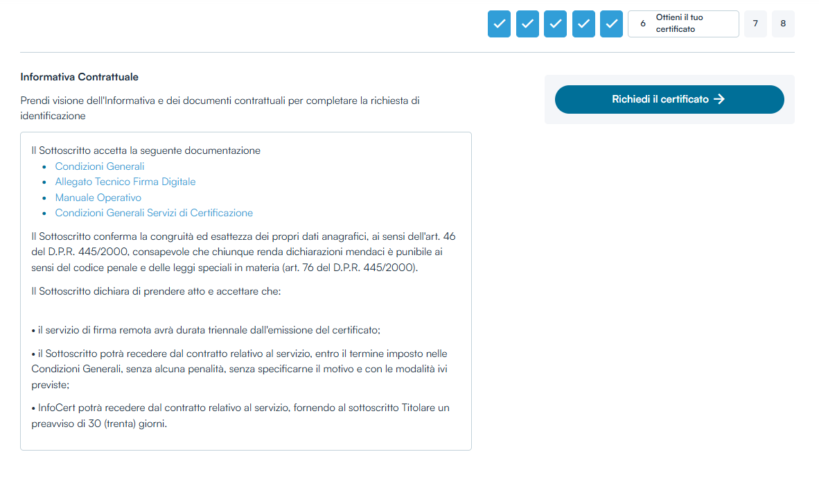 Una volta scaricati e salvati sul dispositivo i 4 Documenti presenti nella schermata cliccare su Richiedi il certificato.