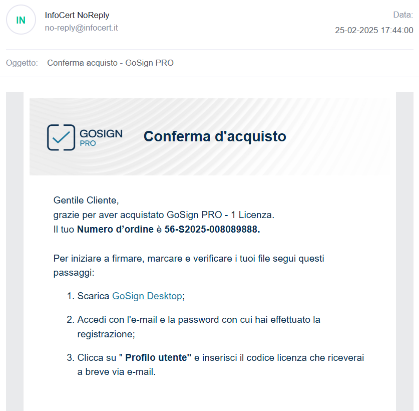 In questa prima mail è presente il numero d'ordine (es. 56-S2025-XXXXXXXXX) associato al tuo acquisto GoSign PRO.