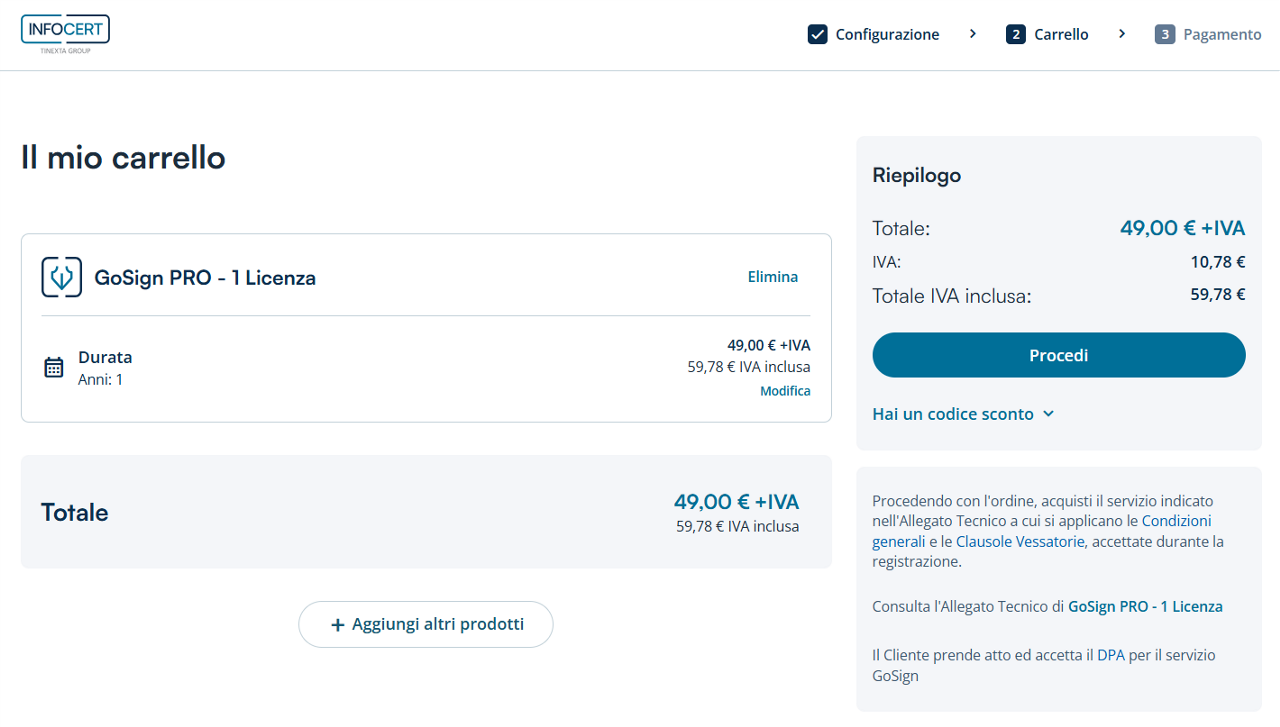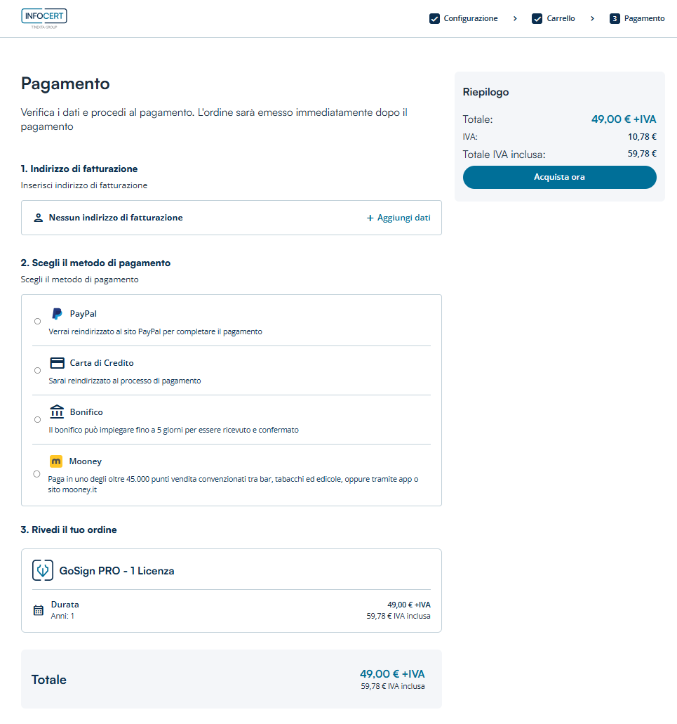 Eseguito l'accesso su InfoCert, la procedura di acquisto passa per la selezione del metodo di pagamento che si intende utilizzare tra quelli presenti in pagina.