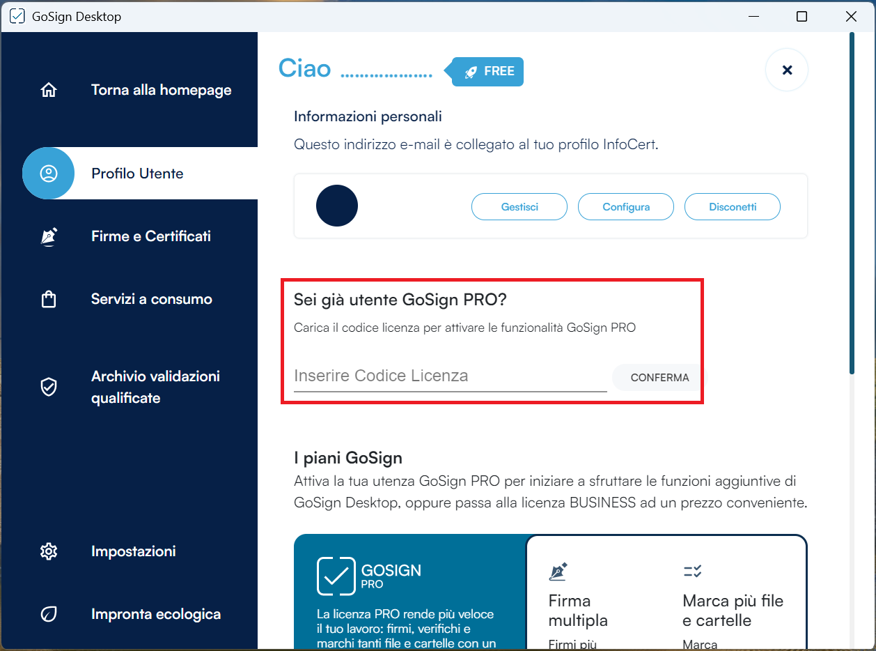 Dopo aver scaricato/aperto GoSign Desktop, cliccare su Profilo Utente.