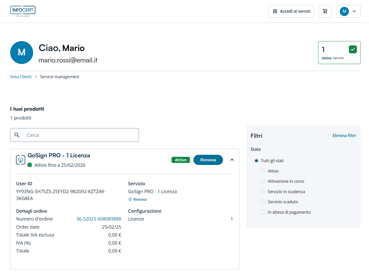 Accedendo all'Area Clienti con le credenziali del negozio InfoCert, puoi verificare: