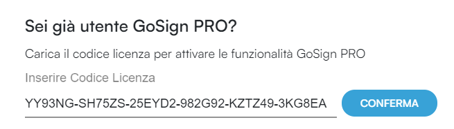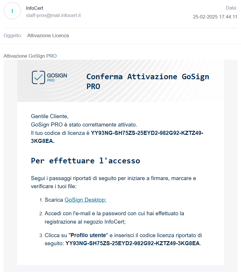 L'email ti dà conferma dell'attivazione della licenza GoSign PRO e fornisce la chiave (codice licenza) necessaria per configurare la licenza sul software di firma GoSign Desktop.