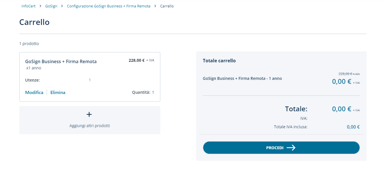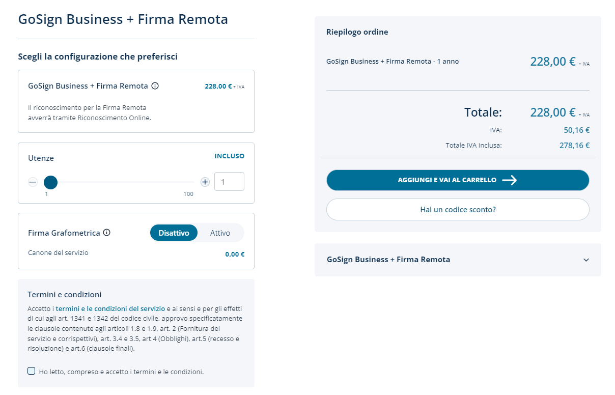 Per prima cosa è necessario procedere all’acquisto del pacchetto “GoSign Business + Firma remota”: una volta aggiunto il prodotto al carrello e apposto il flag sull’accettazione dei “Termini e condizioni del servizio”, è possibile cliccare su Aggiungi e vai al carrello.