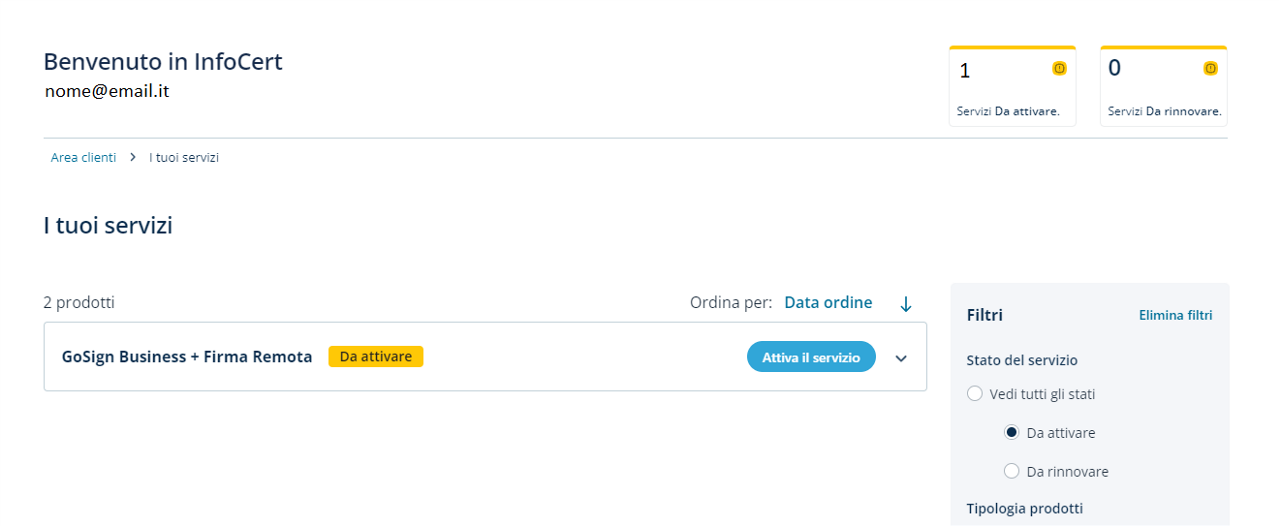 All’interno del proprio account negozio, una volta completato l’acquisto, sarà visibile il nuovo prodotto acquistato nella sezione “I tuoi servizi”: cliccando sul tasto Attiva il servizio sarà possibile scegliere se associare il certificato sull’indirizzo e-mail con cui è stato effettuato l’acquisto o se sceglierne una differente.