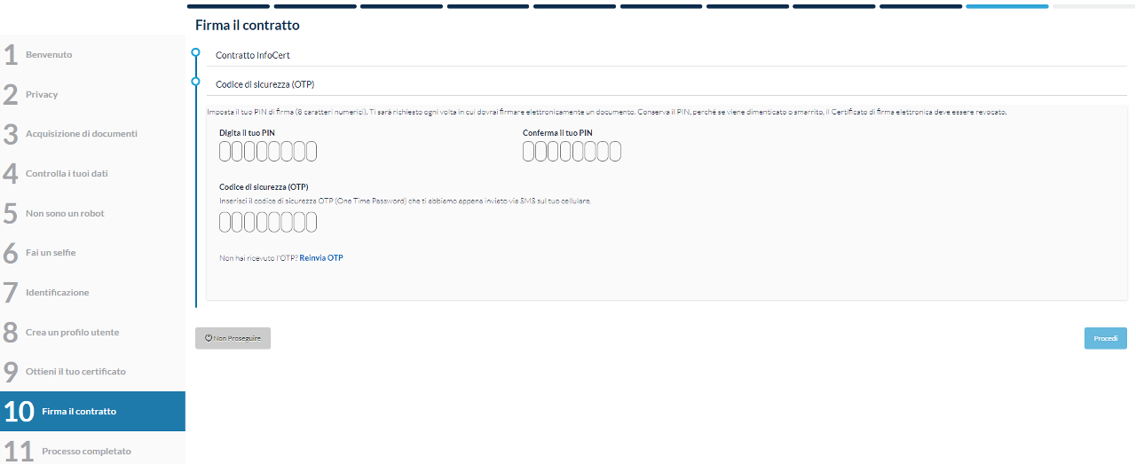 Alla firma del contratto, seguirà l’impostazione del PIN di firma e l’inserimento dell’OTP (One Time Password) che sarà ricevuto via SMS sul cellulare.