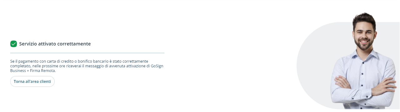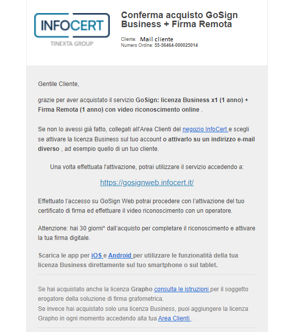 Verrà ricevuta un’e-mail di conferma acquisto, contenente il link al servizio GoSign Web.