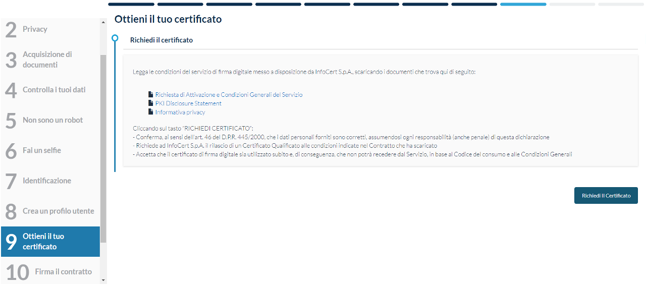 Lo step 9 permette di prendere visione dei documenti relativi alle condizioni del servizio.