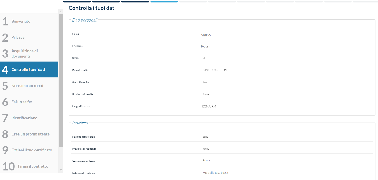 Lo step numero 4 richiede il controllo dei propri dati personali, quelli relativi all’indirizzo, al documento d’identità caricato e i contatti e-mail e telefonico.