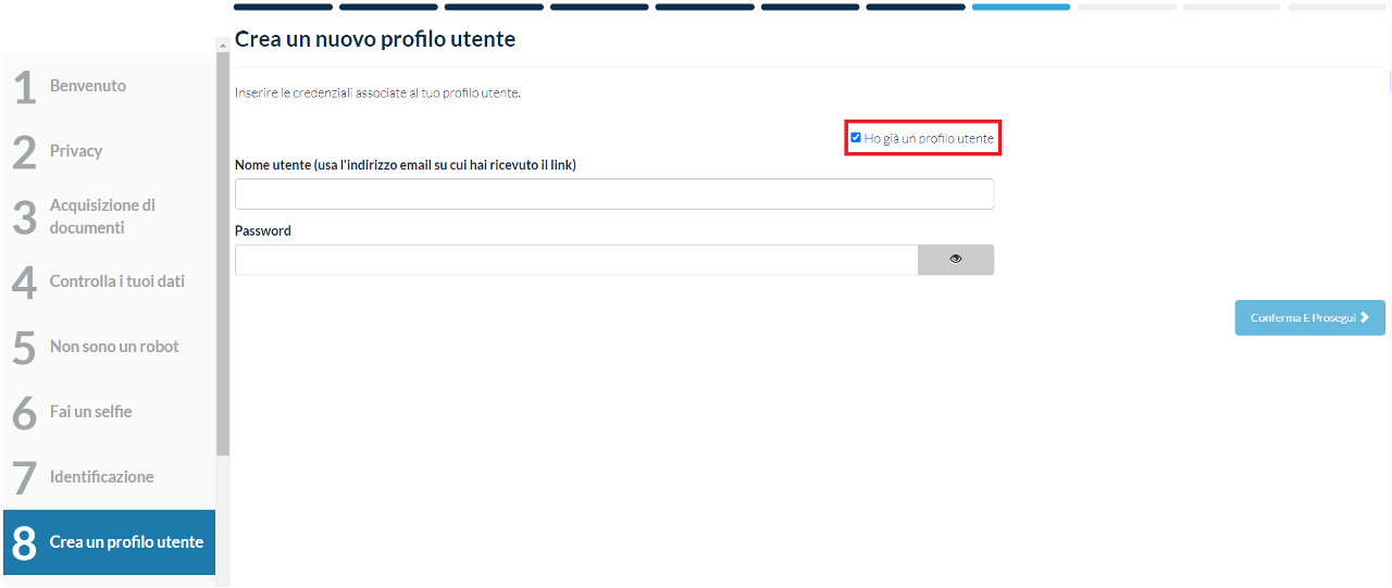 Dopo aver concluso il videoriconoscimento con l’operatore, sarà necessario creare un profilo utente utilizzando le stesse credenziali scelte dopo l’acquisto per l’associazione del prodotto, flaggando la casella Ho già un profilo utente.