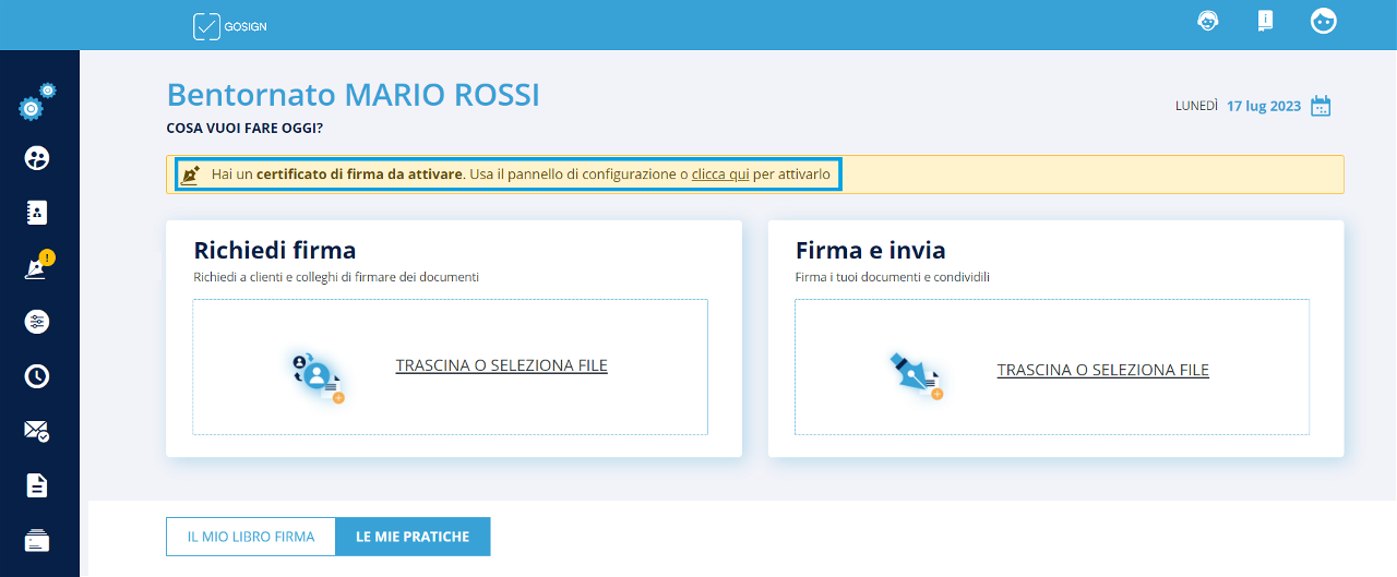 Accedendo alla piattaforma GoSign Web comparirà una notifica come promemoria per l’attivazione del certificato di firma digitale acquistato.