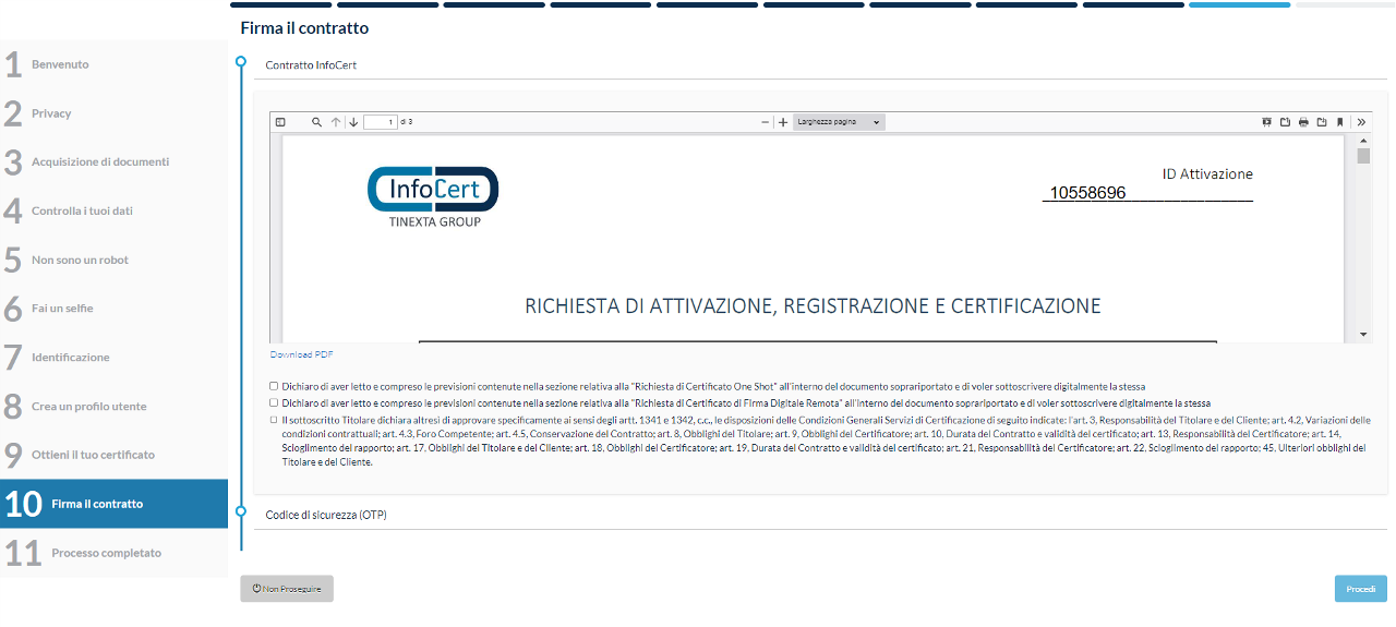 Lo step 10 prevede la firma del contratto, tramite il flag sulle dichiarazioni espresse. Un click su Procedi permetterà di sottoscrivere il contratto.