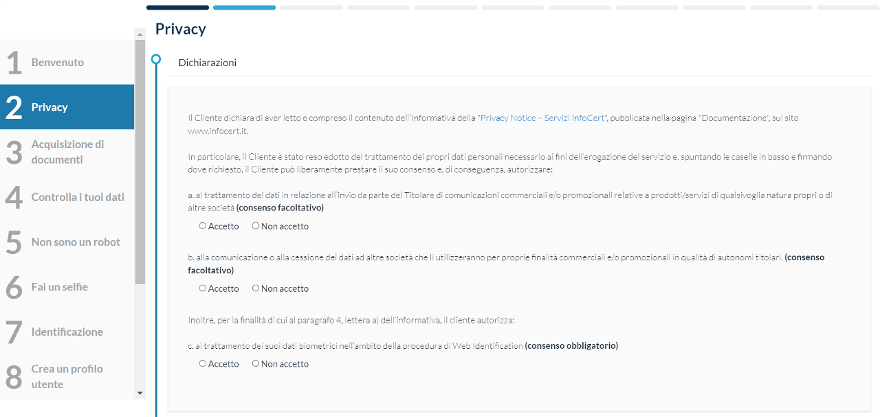 Il secondo step prevede l’accettazione dell’informativa privacy.