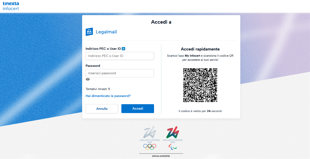 Accedere alla PEC Legalmail nelle modalità consuete, inserendo: