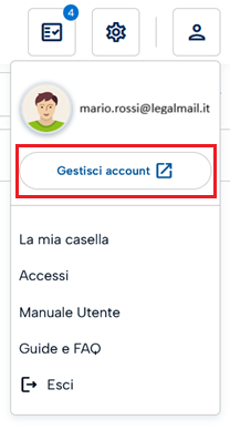 Una volta acceduti alla casella, fare clic sul pulsante in alto a destra (icona user), quindi, cliccare sul pulsante Gestisci account.