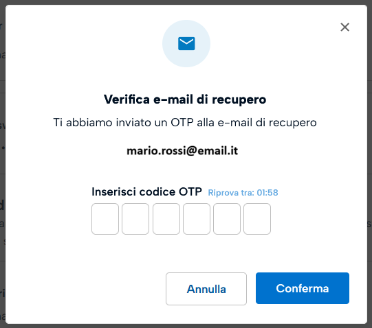 Inserisci il codice OTP ricevuto sulla mail di recupero account precedentemente impostata.