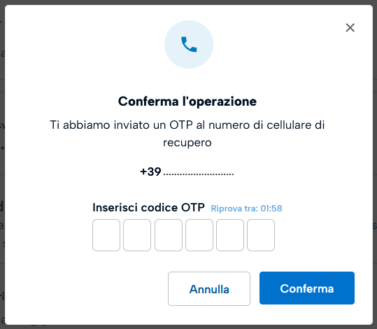 Inserisci il codice OTP ricevuto sul numero di cellulare di recupero account precedentemente impostato.