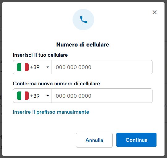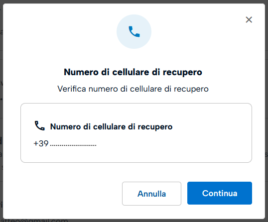 Cliccando sul riquadro Numero di Cellulare di recupero sul pulsante Modifica confermare l'operazione cliccando su Continua.