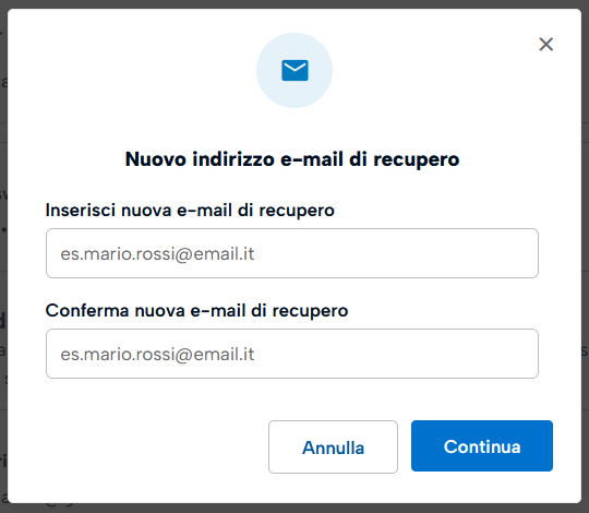 Cliccando sul riquadro Indirizzo email di recupero sul pulsante Modifica confermare l'operazione cliccando su Continua.