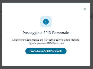 Accedendo al Portale SelfCare con l’utenza sospesa del minore, comparirà un avviso che permetterà di iniziare la procedura di upgrade allo "SPID Personale".